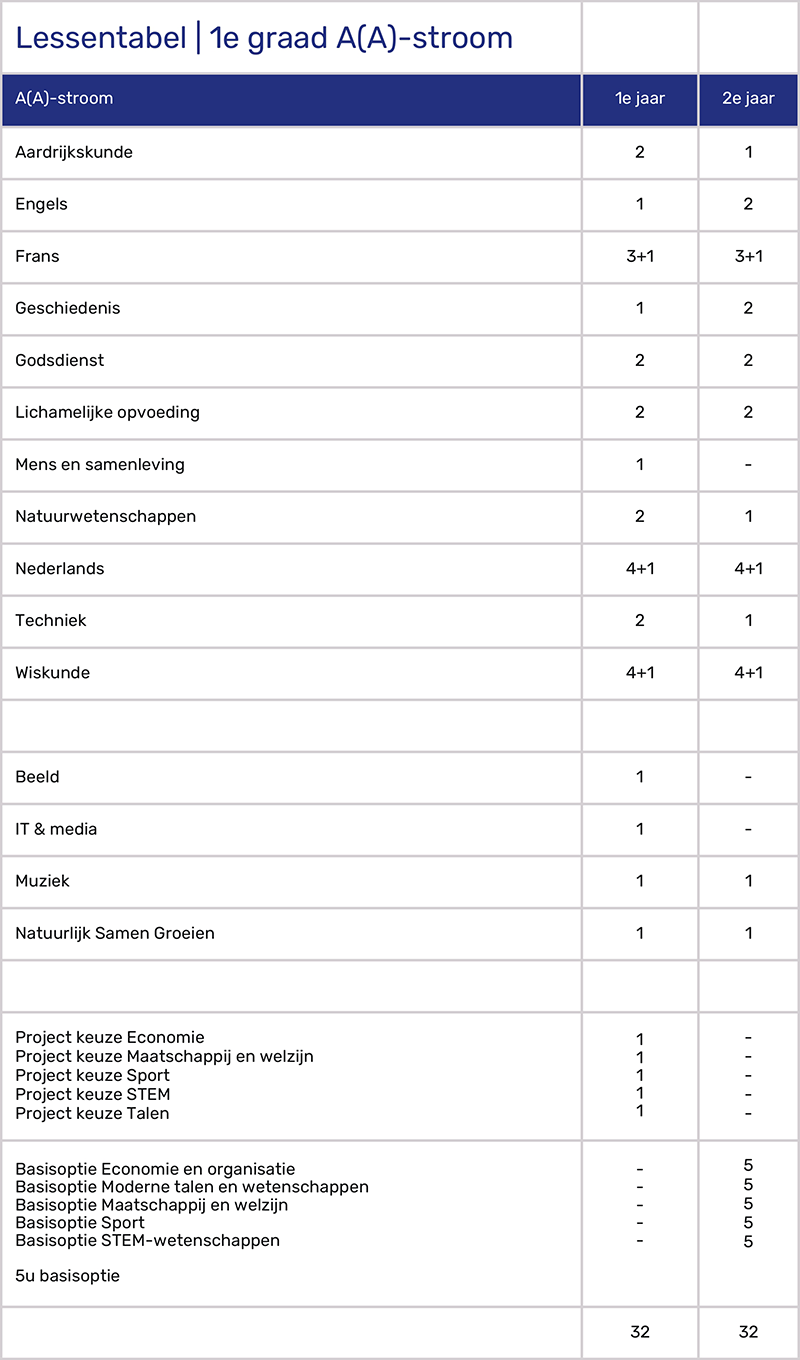 Samen met jou bekijken we wat voor jou de beste start is; de A-stroom, waar verdieping en een vlotter tempo centraal staan (AA-stroom), of voor een traject met extra aandacht voor differentiatie (A-stroom). In de eerste graad bouwen begeleiden we jou naar een doordachte studiekeuze. Zo kan je in het eerste jaar al proeven van onze vijf studiedomeinen: Talen, Economie, STEM, Sport en Maatschappij en welzijn. Tijdens het extra uurtje Frans, Wiskunde en Nederlands geven we jou de ruimte voor verdieping en remediëring.